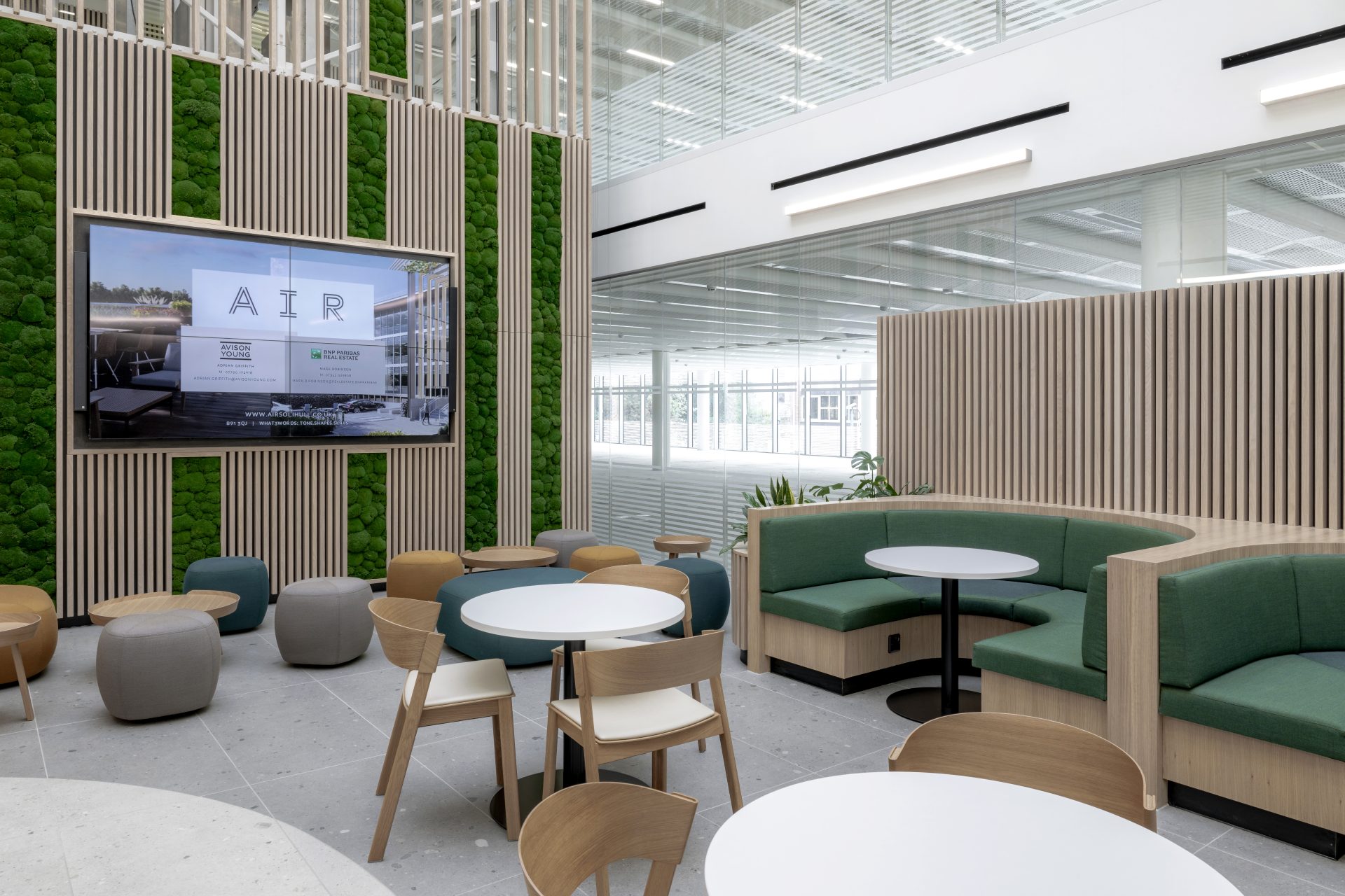 The building is a benchmark building of sustainability and wellbeing, combining corporate professionalism with the comforts of home.