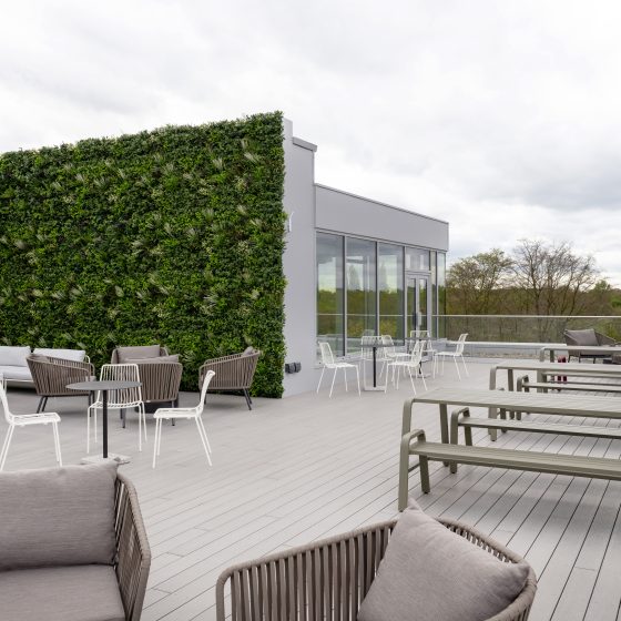 The building has been enhanced to improve its appeal to modern occupiers through the creation of a new triple-height external canopy, fitness studio, cycle hub and a roof terrace with far reaching views over Tudor Grange Park.